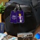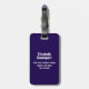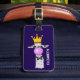 Une étiquette de bagage personnalisée sur le devant et vos informations personnelles sur le dos. Conçu avec un lama géant soufflant une grande bulle rose. Portant une couronne d'or et une cravate d'arc noir. Arrière - plan violet foncé.