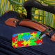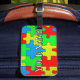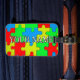 Jigsaw puzzle pattern background decorates this tag with customizable name.