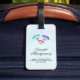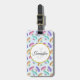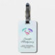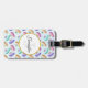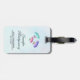 Balise bagage avec un beau motif. Papillons aquarelles, peints dans des couleurs pastel, rose, violet, bleu, jaune et vert. Un arrière - plan d'aquarelle bleu clair avec des touches de rose clair. Placez votre nom et votre lettre monogramme à l'intérieur d'un cercle blanc avec une bordure en feuille d'or. Informations personnalisées sur le dos.