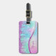 Personnalisez avec le nom violet et le monogramme blanc sur turquoise, bleu et violet arrière - plan Iridescente avec des gouttes de Parties scintillant violet. Coordonnées au dos.