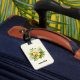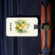 A luggage tag with a lovely illustration of a bouquet of lemons surrounded by white blossoms leaves and sprigs.