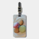 Les macarons français dans diverses saveurs et couleurs d'un plat blanc créent une étiquette de bagage personnalisée par amusement. Photographié à Paris.