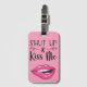 Cette étiquette de bagage tendance kiss me met en scène un dessin d'une paire de lèvres de dessin animé magenta et la légende Shut up & Kiss Me dans une police moderne noire sur un arrière - plan rose.