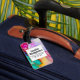 Marque de bagage personnalisée avec un design abstrait artistique sophistiqué. Peinture aquarelle avec les couleurs mélangeant et mélangeant créant un motif marbré fluide. Un cadre blanc avec une fausse bordure en feuille d'or superposée avec votre texte personnalisé écrit à l'intérieur.