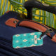 Travel in retro atomic style with this custom personalized luggage tag featuring mid century modern atomic stars with small diamonds in beige, black and avocado green on teal background. you can change the name on design using personalize button