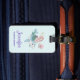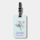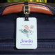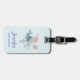 Une étiquette de bagage avec une adorable illustration. Conçu avec une jolie fille de sirène chevauchant un joyeux dauphin. Un petit ami de méduse les accompagne. Décoré de petites taches de parties scintillant en faux or. Arrière - plan bleu clair avec pois rose pâle.