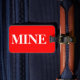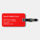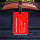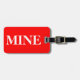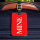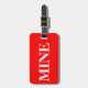 Marque de bagage avec nom et adresse avec un blanc "MINE" sur une couleur arrière - plan rouge. Personnalisez avec votre nom et vos informations d'adresse en utilisant les modèles faciles.