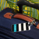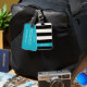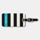 Chic luggage tag features wide black and cream stripes with a summery turquoise aqua colorblock accent. Customize the back with your name and contact details.