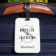 Une étiquette de bagage moderne et élégante pour un couple marié en lune de miel présente un design simple et chic de monogramme qui peut être personnalisé avec les noms de mariée et de mariée, le nom de famille marié initial, et la date de mariage accentué avec les coeurs. Les couleurs noir, blanc, gris et rouge peuvent être modifiées.
