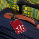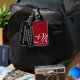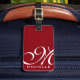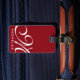 bagage rouge personnalisé avec sangle en cuir : monogramme de gros caractères et nom
