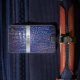 Faux classique arrière - plan en cuir de reptile bleu avec étiquette métallique faux argent. Initiales et modèles monogrammes créés pour vous à l'avant et à l'arrière.