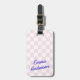 Balise bagage avec votre nom en bleu une police de style rétro sur un motif de damier rose pâle et blanc.
