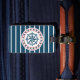Design nautique avec décoration de boussole en forme ronde sur bleu et blanc rayé arrière - plan