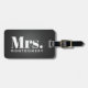 Voyagez dans le style avec cette étiquette moderne de bagage pour des jeunes mariées et des nouveaux mariés. Caractéristiques de conception ce un arrière - plan de cuir de noir de faux avec "Mme" et de votre nom de famille dans une typographie gris-clair moderne de manuscrit. Le dos de l'étiquette de sac a vos détails de contact qu'il faut que vous personnalisiez dans gris-clair sur un arrière - plan noir de cuir de faux. Conçu par l'artiste Coffey ©Susan.