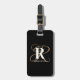Cette élégante étiquette de bagage monogrammée moderne et élégante comporte une initiale en or avec une initiale en blanc et un nom en gras superposé, sur un arrière - plan noir.