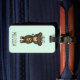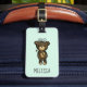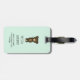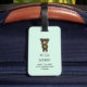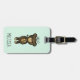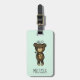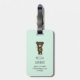 Une étiquette de bagage personnalisée avec une simple illustration d'un ours brun caricaturé tenant une marguerite jaune. Bonjour écrit au-dessus de sa tête. Placé sur un arrière - plan vert pâle.