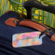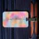 Conception moderne et personnalisée d'étiquette de bagage avec un fond coloré pastel et votre nom écrit dans un script fantaisie moderne. Le texte est entièrement personnalisable.