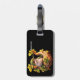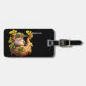This rectangular black luggage tag features a vibrant illustration of a small green-headed bird perched in a nest of golden leaves. it can be personalized with any name you would like it is printed on the right side.