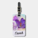 Une étiquette de valise avec une jolie photo d'un crocus violet foncé placé à l'intérieur d'un pot en verre. Une légère fleur violette est présente dans l'arrière - plan.