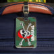 Un crâne de pirate avec bandanna rouge et patte d'oeil est posé sur l'arrière - plan de camo vert. Son nom est dans une police blanche en détresse. Nom et adresse au dos.