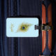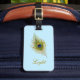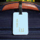 Elégante plumes de paon et calligraphie sur étiquette de valise bleu clair.