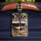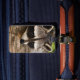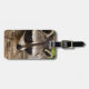 Une étiquette de bagage avec la photo d'un raton laveur mignon et curieux reposant son visage sur un rondelle de bois. Adorable.