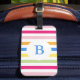 Rainbow colored candy stripes on monogrammed luggage tag.