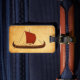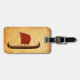 A Viking long ship with a red sail seen in profile from the right side and superimposed on an old paper background image. Customize by adding your own name and address. You may change both the text font and color.