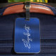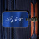 Une étiquette de sac de prénom pour son voyage d'affaires. L'arrière dispose d'une fente pour vos cartes de visite. Le script est un joli, brosse trait moderne écriture manuscrite qui est un cadeau parfait pour elle. Le style de brosse décorative peut nécessiter que vous remettiez votre nom. Vous pouvez également customiser la couleur de police et le style de calligraphie. L'arrière - plan est doté d'une feuille de métal brossé bleu royal et bleu marine bleu foncé. L'arrière - plan glamour de l'art numérique imprimera comme une photo.