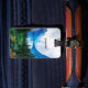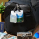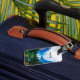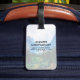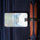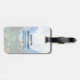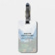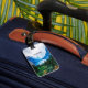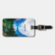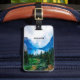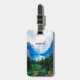 Un bagage tag avec une belle photo d'une scène nature agréable et tranquille. Forêt verdoyante à l'avant et montagnes bleues à l'arrière. Avec un ciel blanc nuageux et onirique. Ambiance mélancolique et magique.