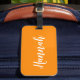 Personnalisez cette étiquette de bagage de calligraphie de script amusante et tendance avec votre nom ! C'est la version orange vif. Idéal pour vos vacances d'été, enterrements de vie de jeune fille, colonie de vacances pour enfants ou vacances de printemps !