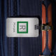 Personalize for business traveler; black name and monogram on green and silver box on silver metal background. Has QR code and your logo with contact info on back.