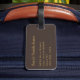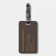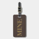 Marque de bagage avec nom et adresse avec un bronzage "MINE" sur une couleur arrière - plan brune. Personnalisez avec votre nom et vos informations d'adresse en utilisant les modèles faciles.