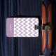 Une étiquette à bagages mauve et blanche tendance avec un motif chevron crayon de couleur à la main. Personnalisez ce design de zigzag lavande moderne et élégant en ajoutant votre nom.