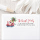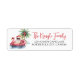 Étiquette d'adresse de retour Santa Tropical Noël. Cette étiquette d'adresse de retour festive présente un Père Noël décontracté se prélassant dans un flotteur de flamant rose, entouré de détails de vacances tropicales comme un palmier décoré d'ornements, des vagues océaniques douces et une petite île en arrière-plan. L'illustration charmante à l'aquarelle apparaît à gauche, tandis que votre nom et adresse sont à droite dans un mélange de polices de caractères script et serif, le nom étant affiché en rouge pour une touche saisonnière audacieuse.