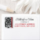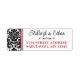 Ces étiquettes d'adresse de retour de mariage damassé noir et blanc ont un motif damassé sur le côté gauche avec la zone de texte en blanc qui correspond au faire-part de mariage ci-dessous. Vos nom(s) et adresse(s) de retour sont en lettres noires et rouges avec un séparateur de défilement noir orné entre eux.