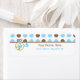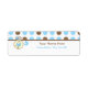étiquettes de adresse baby showers avec une bordure supérieure de pois bleus et bruns sur blanc avec garniture brune. Broche à couches bleues attachée à la bordure et forme circulaire avec chariot à bébé bleu à l'intérieur. Personnalisez le texte avec votre nom et votre adresse.