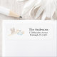 Étiquette d'adresse de retour avec cigogne d'aquarelle portant un bébé enveloppé dans une couverture bleue pour correspondre à notre collection de cigognes d'aquarelle trouvée sur ma page Zazzle. Customisez avec votre nom et votre adresse.