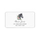 Étiquettes de adresse avec une belle illustration d'une tête de cheval noire avec un embellissement floral fantaisie par son cou. Peinture animale élégante et classe.