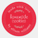 L'étiquette Biscuits Maison Rouge Rustique est une autocollante ronde avec un fond rouge vif, un lettrage blanc doux et des détails de bordure rustique cousus. Parfaite pour les biscuits maison, les friandises cuisinées, les faveurs de fête et les produits de cuisine en petite quantité, cette étiquette ajoute une touche chaleureuse et personnelle à votre emballage. Le message « fait avec amour » et la ligne de nom personnalisable en font l'idéal pour les foires artisanales, les cadeaux et la marque des boulangers maison.