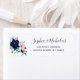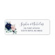 Ces étiquettes d'adresse de retour mariage élégantes et tendance sont ornées d'un arrière - plan blanc avec des fleurs d'aquarelle de couleur marine et des feuilles verts. Vos noms et votre adresse de retour apparaissent dans le texte moderne bleu marine foncé et la typographie de script.