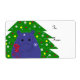 Un hippopotame mignon avec un arc rouge autour du cou devant un arbre de Noël. Des ornements et des flocons de neige recouvrent l'arbre.