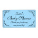 Frottez et fleurissez étiquettes de bouteille d'eau de baby shower. Autocollants de biberon bleu pastel personnalisés avec coins tourbillonnant. Modèle do-it-yourself personnalisé avec typographie stylisée de calligraphie. Design vintage et neutre pour célébrer la naissance d'une nouvelle petite fille ou d'un nouveau garçon. Utilisez comme décor de table classe ou merci pour les invités à la fête. Couleur arrière - plan personnalisable, c'est-à-dire rose girly ou jaune doux. Merci de partager notre journée spéciale.