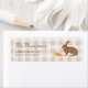 Destei's watercolor illustration of a brown hare rabbit together with some carrots. The background features a beige gingham pattern and there are two personalizable text areas including one for a name and another for the address. Ideal for Easter and spring, it also suits rustic, farmhouse, countryside and cottage styles.