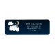 Étiquette d'adresse de retour sucrée pour votre baby shower à thème lullaby. Illustration de nuages avec un lapin qui regarde sa tête de l'un d'eux. Customisez ce produit en ajoutant le nom de la famille et l'adresse de retour. Il y a une lune dorée et des étoiles sur un arrière - plan bleu marine. Illustration et dessin originaux de Namibear Art Studio.©Namibear