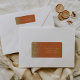 Le bord gauche de cette élégante étiquette d'adresse de retour mariage moderne présente une conception de parties scintillant en faux or. Le texte personnalisable combine écriture manuscrite couleur or pâle, cuivre et polices italiques sur un arrière - plan orange brûlé.
