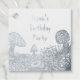 Les champignons poussent ensemble dans un pré. Le recto a une version en feuille avec le texte de l'événement d'anniversaire. Le dos a une impression du dessin original à l'encre violette avec un message de remerciement pour les personnes présentes à la fête.