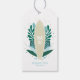 Vague à l'âme ! Étiquette de remerciement pour baby shower sur le thème du surf tropical avec une planche de surf au grain de bois naturel et des feuilles tropicales dans des tons d'aqua et de vert.