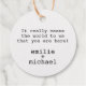 Une étiquette de faveur ronde thème de voyage qui ressemble à un globe dans l'impression réelle de papier or ou argent avec "Merci - cela signifie le monde pour nous que vous êtes ici" message sur le dos, par un designer expérimenté dans la destination mariage et Voyage thème nuptiale douche, mitzvah, et besoins de réception. Personnalisez avec votre propre message et vos initiales, et modifiez les couleurs et les polices au verso en cliquant sur "customiser plus loin".