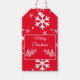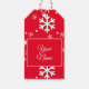 Des flocons de neige blancs et des arbres de Noël sur un arrière - plan rouge. Modifiez le nom à l'arrière de la balise sur votre propre nom ou supprimez la zone de texte. Si vous aimez le thème de l'emballage, vous pouvez trouver un sac cadeau avec le même design dans le magasin The Beau Corner avec ruban de flocons de neige et papiers d'emballage qui va parfaitement avec ce design. Vous pouvez changer la couleur de l'arrière - plan en couleur si vous le souhaitez.